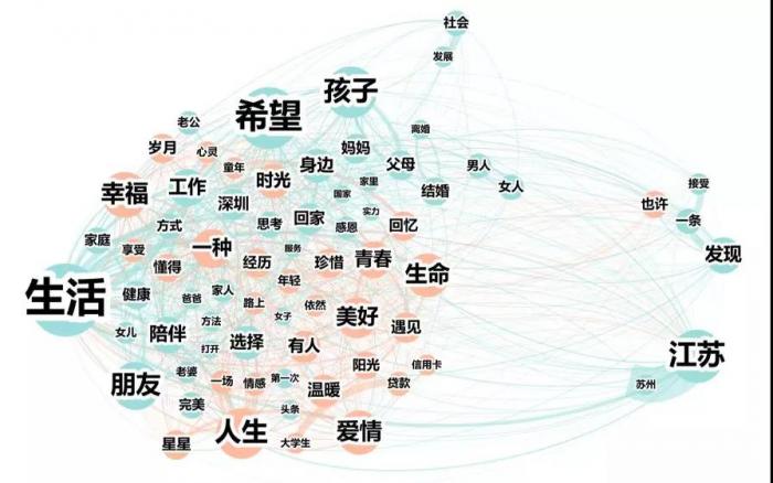 2018年,70后基本进入“奔五”的阶段。从2013年追忆青春年华,畅谈恋爱观念,到2018年感悟人生,感恩生活,根据语义网分析推测,“70后”基本度过了中年危机,经历过中年危机的70后,更加珍惜当下的生活。尽管来自各方面的压力仍然存在,对“70后”的讨论转向对亲情、爱情、学业、事业的关注,更加聚焦深刻的人生感悟。