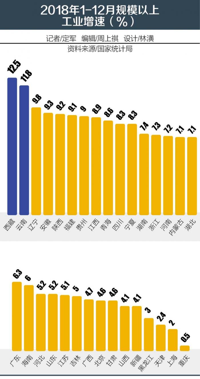 根据国家统计局公布的数据,2018年全年规模以上工业增速最低的三地分别是天津、上海、重庆。北京增速在全国也处于靠后位置。