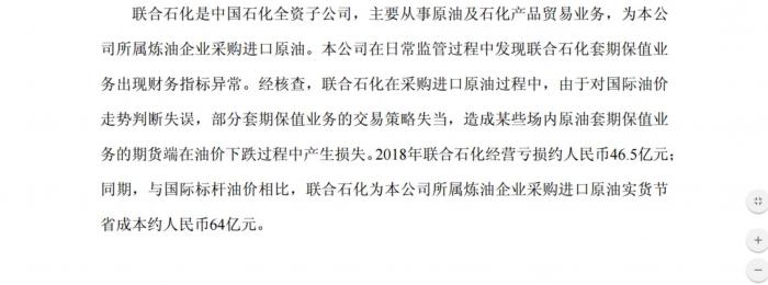 中国石化在公告在公告中称,经核查,联合石化在采购进口原油过程中,由于对国际油价走势判断失误,部分套期保值业务的交易策略失当,造成某些场内原油套期保值业务的期货端在油价下跌过程中产生损失。由此,2018年联合石化经营亏损约人民币46.5亿元。