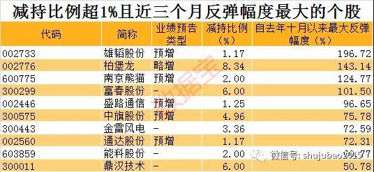 在股东拟减持比例超过1%的上市公司中,10家公司发布减持公告的前5个交易日内股价自去年10月低点以来的反弹幅度超过50%,雄韬股份、柏堡龙、南京熊猫、富春股份4股股价自三个月前的低点已翻倍。