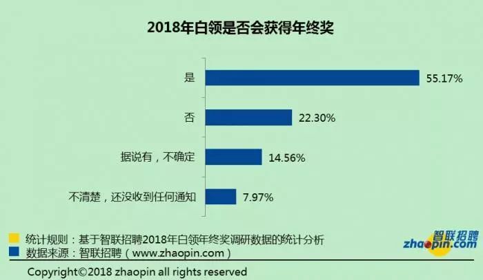 智联招聘报告显示,参与调查的白领中有55.17%表示能拿到年终奖,比例较2017年的66.1%下降明显。2018年的全国白领年终奖总体均值为7100元。仅39.10%的白领的年终奖收入增加了,持平的为45.35%,减少的为15.55%。