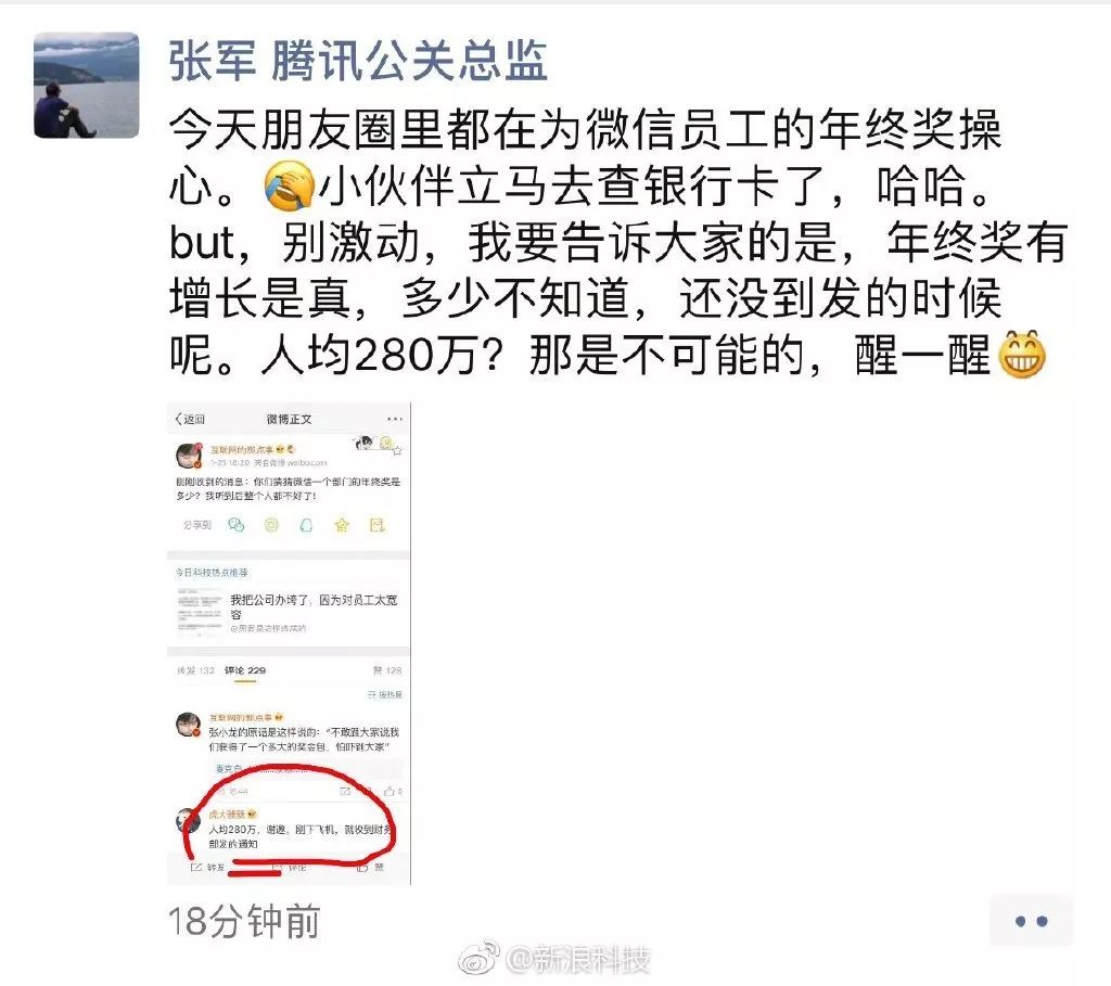 不久后,腾讯公关总监张军辟谣:“今天朋友圈里都在为#微信年终奖#操心。小伙伴立马去查银行卡了,哈哈。but,别激动,我要告诉大家的是,年终奖有增长是真,多少不知道,还没到发的时候呢。人均280万?那是不可能的,醒一醒!”
