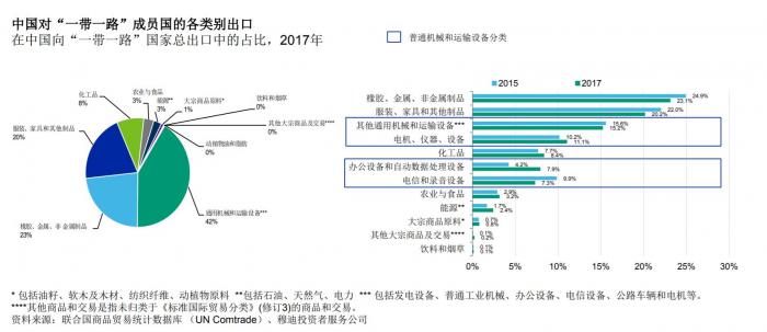 普通机械和运输设备在中国向“一带一路”成员国的货物总出口中占比最高(42%),其次为橡胶、金属和非金属制品(23%),这是受到“一带一路”成员国基建项目需求的推动。但办公设备和自动数据处理仪器同比增速最高,达3.7个百分点,电气机械位居其后,为0.9个百分点。电信设备下降了2.6%,是所有行业中跌幅最大的。