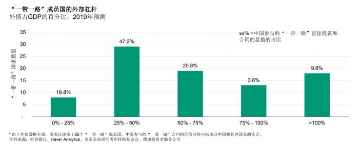 此外,超过四分之一的“一带一路”成员国外部杠杆较高。欧洲新兴市场、南亚和东南亚的政府和外部杠杆逐渐上升。据穆迪估测,印度尼西亚的总体政府杠杆由2013年的24.9%升至2019的29%,同期外部杠杆由29.2%增至34.4%。大约36%的“一带一路”成员国的外债/GDP比率高于75%。中国参与的“一带一路”投资和合同共有13.2%位于这些国家。