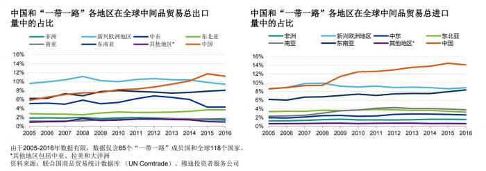 穆迪认为,“一带一路”成员国对全球供应链的重要性将持续提高。2005-2016年“一带一路”成员国每年实际GDP增速 (4.1%) 高于全球平均水平(2.7%),推动了最终消费品的进口。不断提高的竞争力和制造能力促进了这些国家最终消费品(特别是高附加值货物)的出口。 中间品贸易方面,“一带一路”成员国在全球供应链中维持其重要作用,过去5年出口和进口均占全球贸易的29%以上。