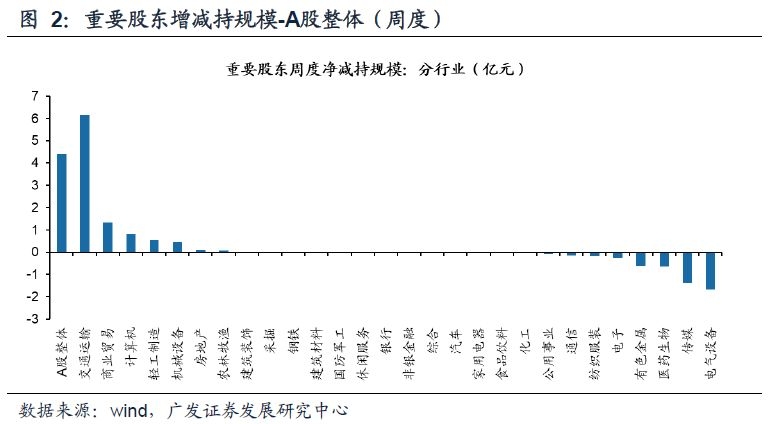 (2)重要股东增减持(A股整体):上周重要股东净增持4亿元,前一周净减持4亿。其中净增持规模前三分别为交通运输、商业贸易、计算机; 减持规模前三分别为电气设备、传媒、医药生物。