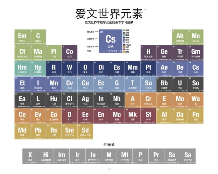 而爱文独特的“世界元素”系统(AWE)以化学元素图的形式浓缩出爱文全球共享的课程体系对学生的培养标准。例如,第1个元素是 同理心(Em),还有身份认知(I)、数据分析(Da) 、批判性思维(Ct) 等等,共65个元素。全球的家长、学生、老师能以此理解爱文力图让学生达到的基本目标——通过导师体系、高强度训练、双语沉浸、探究、跨学科式学习等各种学习体验,爱文总结出上述标准,以此切实培养毕业生。“世界元素”也是纽约校区、圣保罗校区等爱文所有校区的课程大纲,能够确保爱文全球共享课程体系的统一标准。