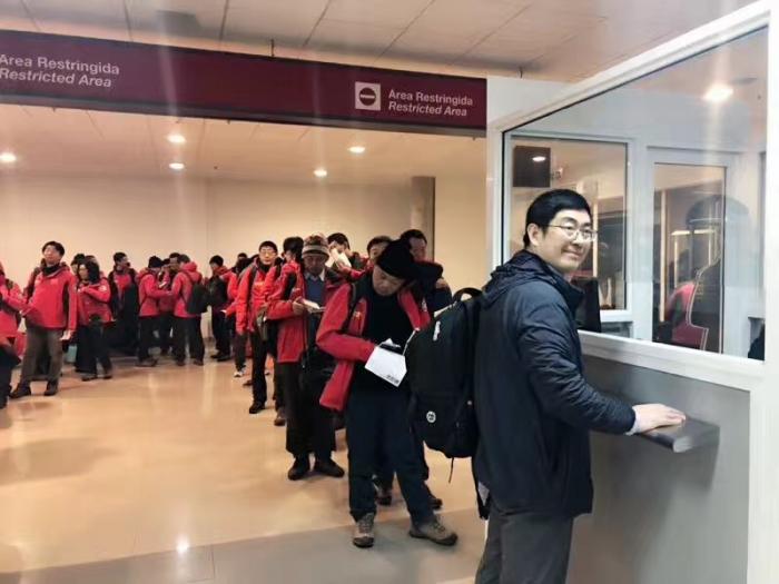 与此同时,中国驻智利使馆另外一个支持团队已为53名科考队员定好回国机票。由于使馆提前与智利出入境管理局进行了沟通,管理局开通现场办公窗口,为他们办理手续,所有人顺利入境。53名“雪龙号”科考队员一个不少,准备踏上回国团聚的旅途。