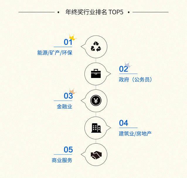 能源/矿产/环保行业在年终奖行业排名中位列第一。报告显示,全国年终奖行业排名前五分别是:能源/矿产/环保、政府(公务员)、金融业、建筑业/房地产和商业服务。