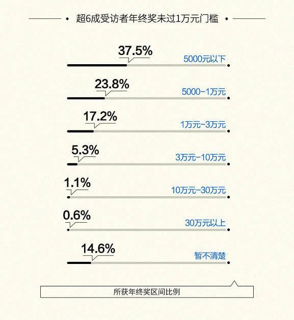 此外,超6成受访者年终奖未过1万元门槛,4成受访者年终奖不及预期。报告显示,61.3%的受访者年终奖未过万元门槛,22.5%的受访者年终奖在1万元至10万元之间,只有1.7%的受访者年终奖在10万元以上。47.1%的受访者年终奖金额与期望值持平,41.4%的受访者年终奖金额比期望值少。