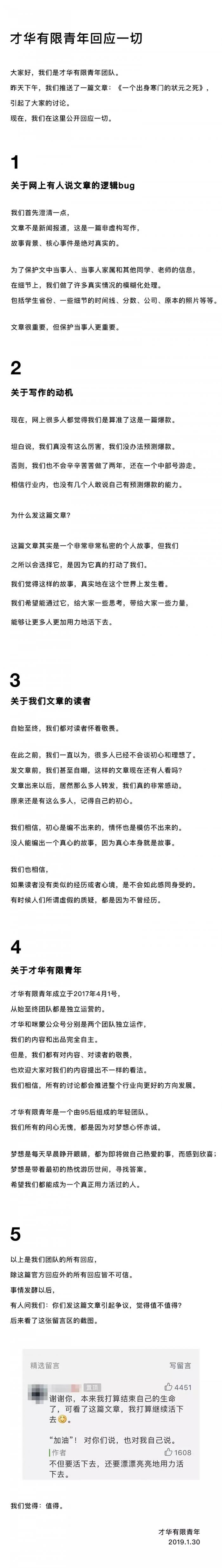 1月29日晚间,咪蒙旗下公众号一篇名为《一个出身寒门的状元之死》的文章在朋友圈刷屏。这篇刷屏热文是由微信公众号“才华有限青年”推送的。文中讲述一名出身贫寒,后考入名校的市理科状元从高中到患病去世的经历。