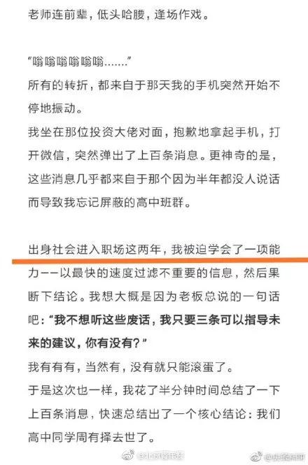 也许有人反驳说,一篇微信公号文章而已,大可以完全当小说来读。可不能自圆其说的是,无论是文中提到的讲述者同学毕业没几年就在阿里快速升职,以致阿里不得不发声明澄清,还是文末看似善意的请大家不去打扰“周有择”家人的提醒,传达的都是讲述真人真事的信息。那么,我们是不是要称赞一下作者“不着痕迹”的高超技巧呢?