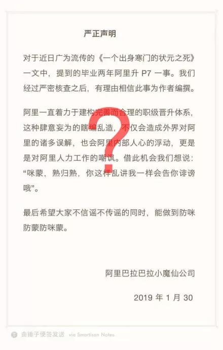 有网友质疑,工作两年的本科生根本不可能在阿里做到p7。今天网上也流传了一张来自“阿里巴拉巴拉小魔仙公司”的严正声明。↓↓
