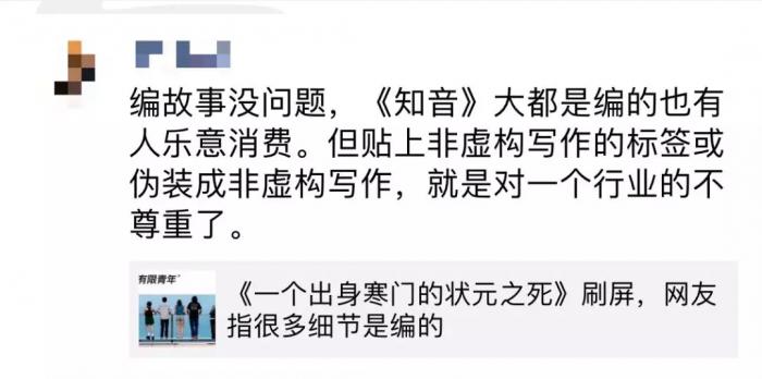 恶意揣测,或许作者既没有把它当小说创作,也不想讲经历谈情怀,而仅仅是为了生产一篇吸引眼球的“爆款”。这背后的逻辑,恐怕就是眼球——流量——收益吧。再退一步,制造“爆款”也不必然要受到指责,像《啥是佩奇》那样,即便也有网友挑刺,但至少大家看的时候是明白的,故事就是故事,与真实是有界限的。