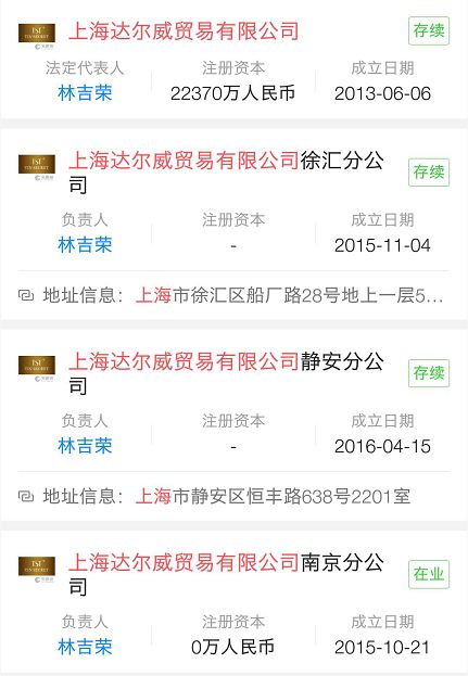 工商信息显示,上海达尔威成立于2013年6月,注册资本22370万元,所在的行业为批发业。其法人代表和董事长为林吉荣,这是林瑞阳的另一个名字。公开资料显示,公司注册了庭秘密、Tin'Secret 、TST等与张庭夫妇所做微商产品相关的多个商标。