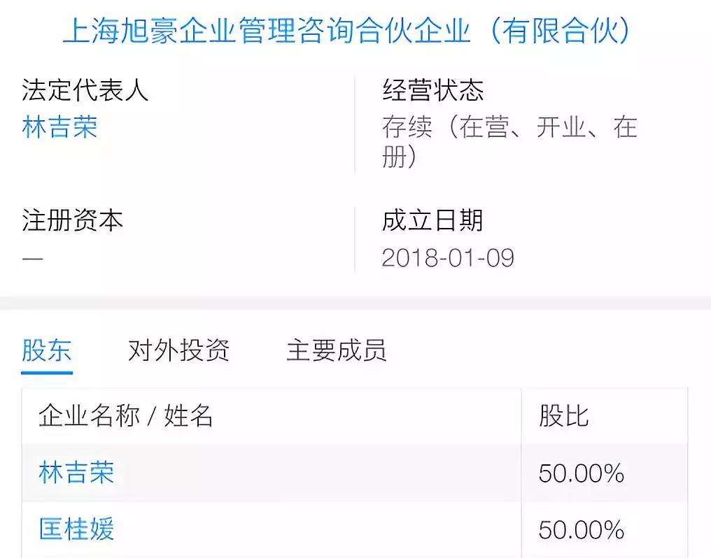 每日经济新闻记者注意到,上海旭豪是有张庭老公林瑞阳(林吉荣)、匡桂媛各持股一半;同时林瑞阳还担任上海远昶的法定发表人。