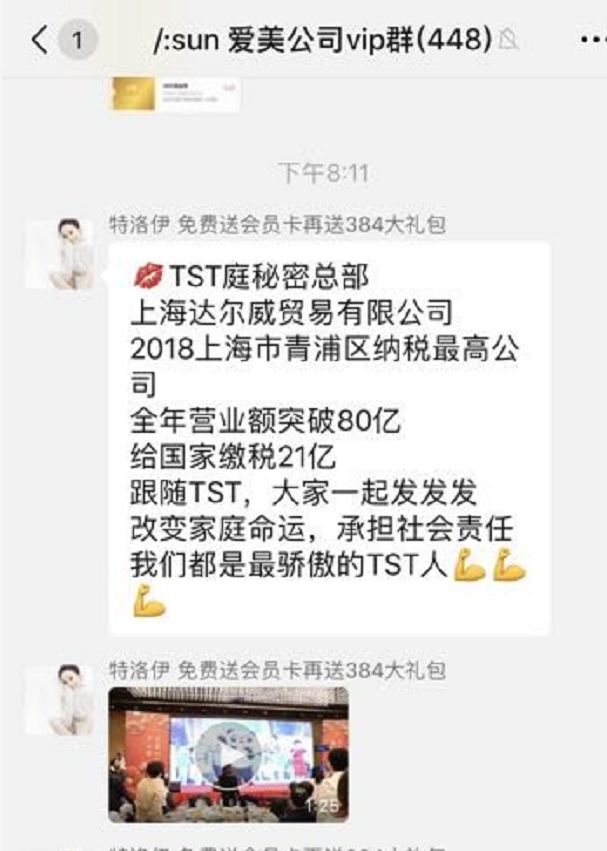 作为青浦区“纳税百强”,上海达尔威2018年度的纳税额虽尚无权威定论,但凭借微商生意登顶青浦区的,其营收规模引人关注。事实上早在2017年,上市公司山东华鹏(603021)曾发布公告指出,上海达尔威当年前三季度实现营业收入36亿元,实现净利润11.43亿元。此外,TST西南大区负责人阿紫在其微博的个人简介中写道,“西南大区旗下800余家集团公司,每月零售销量破4亿,总销量突破80亿。”
