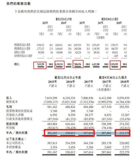 财务数据显示,2015年-2017年和2018年前三季度,中烟国际(香港)分别实现收入76.19亿港元、63.1亿港元、78.07亿港元和50.77亿港元,同期净利润分别达到了3.91亿港元、3.38亿港元、3.48亿港元及2.22亿港元。