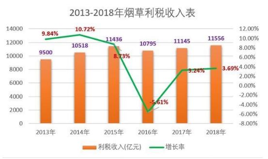 根据中国烟草官网的信息发现,国家烟草专卖局党组书记、局长,中国烟草总公司总经理张建民在2019年全国烟草工作会议上透露,2018年,烟草行业实现工商税利总额11556亿元,同比增长3.69%;上缴国家财政总额10000.8亿元,同比增长3.37%;实现工业增加值7877亿元,同比增长4.88%。
