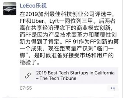 同时,贾跃亭还提到了FF被美国媒体The Tech Tribune评为2019加州10大科技创业公司的事情,在其看来,“FF和Uber、Lyft一同位列三甲。后两者赢在共享经济理念下的商业模式创新,而FF是因为产品技术变革力和颠覆性创新力得到了肯定。”