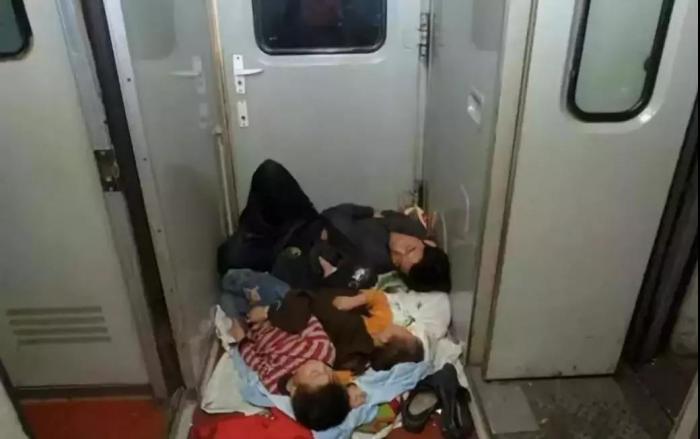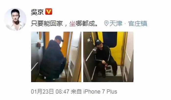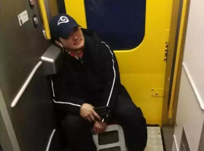 前段时间,吴京回家的时候没有买到火车座位票,只能搬一个小板凳坐在火车链接处。