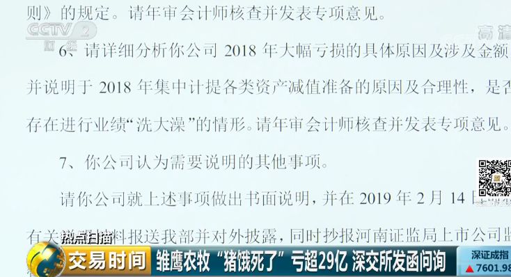 对此,深交所向雏鹰农牧下发关注函,要求说明公司销售生猪单价大幅下滑的具体原因及合理性;说明公司于2018年集中计提各类资产减值准备的原因及合理性,是否存在进行业绩“洗大澡”的情形。