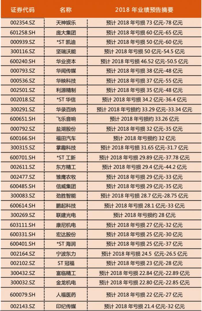 近一周以来,A股有380多家上市公司发布了业绩预告,所称亏损总额达2823.88亿—3287.01亿,里面有相当大部分是商誉减值,其中天神娱乐亏损73亿元至78亿元、庞大集团亏损60亿至65亿元、*ST凯迪亏损50亿至60亿元。更有甚者,华业资本、利源精制、飞乐音响、天山生物、千山药机等9家公司,亏损金额比自己市值还大!