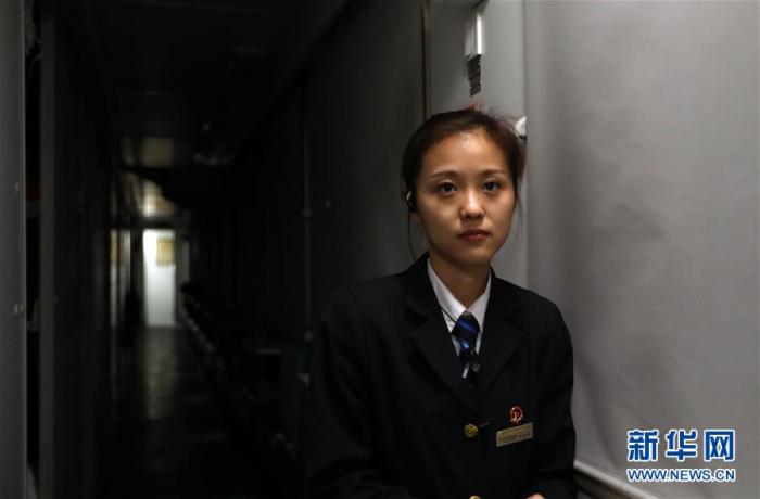 2月1日晚,K7039次列车乘务员万春雨在值班“守门”。 新华社记者 王春雨 摄