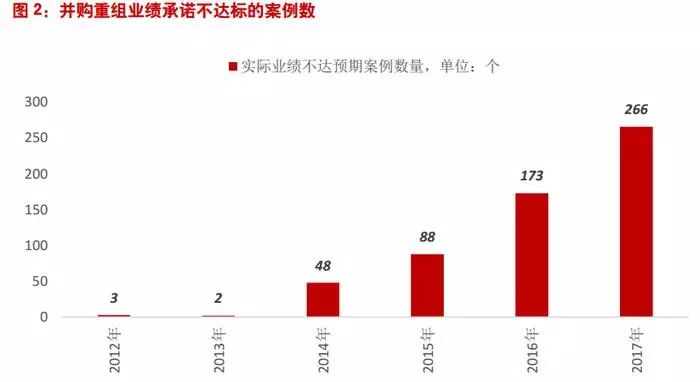 分析原因来看,2015年A股上市公司并购重组正如火如荼,当时存在大量的3年业绩对赌。如今3年业绩承诺期限已到,看似偶然的商誉减值雷其实有其发生的必然性。东方证券统计称,从2012年到2017年,在签署对赌协议的并购案例中,实际利润低于承诺利润的案例正在迅速上升。2015年有88例,2017年已走高至266例,2018年作为不少并购业绩承诺对赌期的最后一年,业绩不达预期的案例预计将继续走升。
