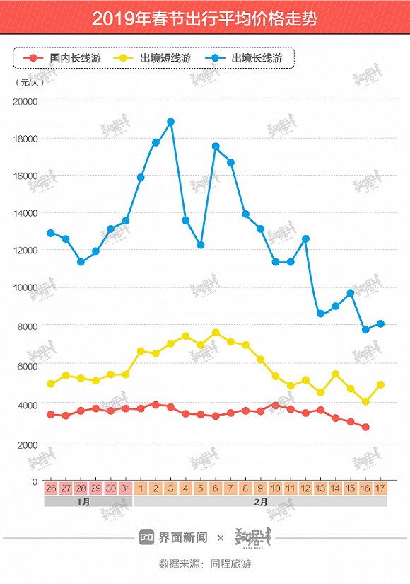 同程旅游数据显示,2019年春节国内长线游价格保持在2500-4000元/人区间,与出境短线游价格差距较小,但仍与出境长线游动辄10000元/人的价格有较大差距。