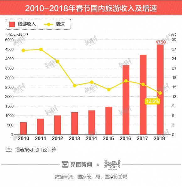 春节国内旅游市场平稳增长。根据国家统计局、国家旅游局数据,2018年春节国内旅游收入为4750亿元人民币,但增速降至12.6%,为2010年以来最低水平。