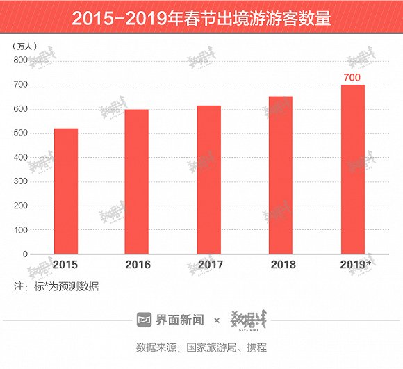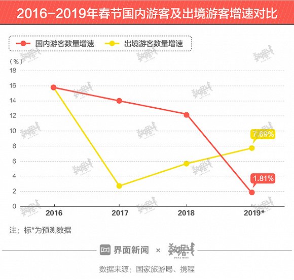 按携程预计数据计算,2019年春节出境游客增速将达7.69%,国内游客增速仅为1.81%。