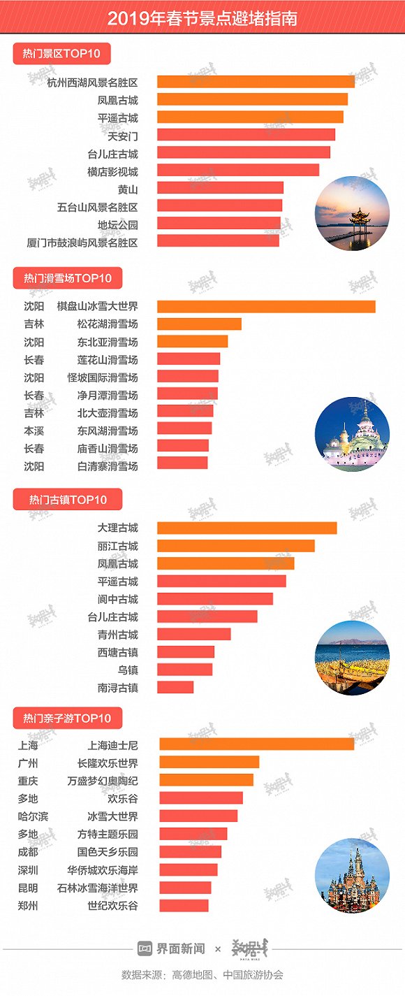 无论去国内还是国外,都避不开堵。根据高德地图数据,2019年春节最热门的景点是杭州西湖,最受欢迎的古镇是大理古城,上海迪士尼是最热门的亲子游目的地。