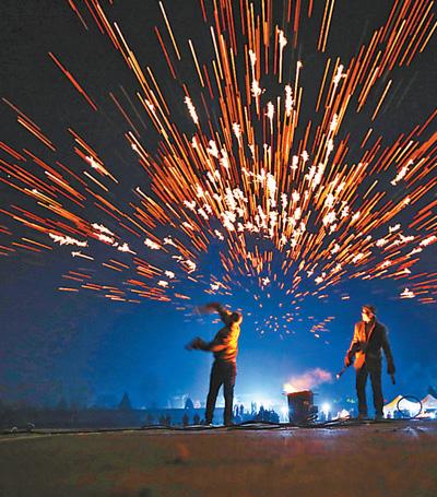 2月1日,河南武陟县嘉应观景区举行“打铁花”迎新春活动,民间艺人将生铁块烧到一定熔度后,用木板将铁块打上天空,形成“铁花火雨”景象,营造出浓浓的节日氛围。冯小敏 摄(影像中国)