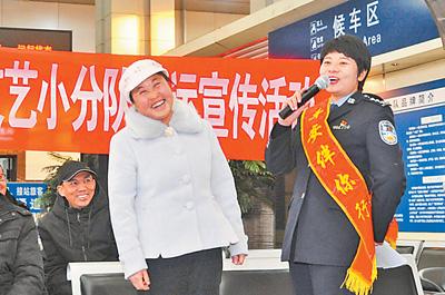为了给回乡旅客营造更温馨舒适的出行环境,大同铁路公安处文艺轻骑兵小分队近日带着精心编排的文艺节目走入车站候车室,为旅客带去欢笑和温暖。任军 摄
