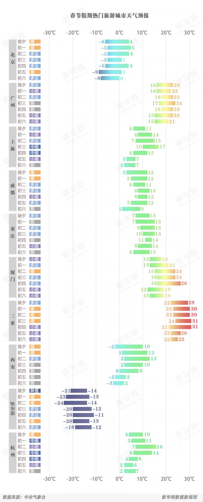 就气温而言,春节期间中东部大部分地区的温度接近常年或比常年同期略偏高一些,但新疆、甘肃西部、东北地区北部等地平均气温则会偏低。总的来说是暖的地方更暖,冷的地方更冷。大家走亲访友要做好防寒保暖工作哦。
