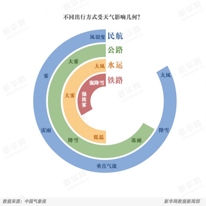 无疑,飞机是受天气影响最大的交通工具。大风、雷雨、雪、雾、垂直气流等会直接给飞行环境、可视条件造成不同程度的困难,影响到飞行的安全和质量。近年来,春运期间自驾占公路出行的比例越来越高。恶劣天气是公路出行面临的风险之一,影响比较大的主要是大雾、降雪和冻雨,会导致高速公路封闭、路面湿滑,加大了行车风险。
