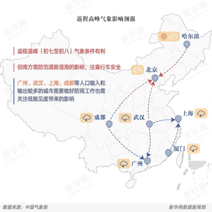 到了初七、初八的返程高峰,自驾要特别注意因为南方阴雨导致的道路湿滑,路经广州、武汉、上海、成都时,更要注意低能见度带来的行驶风险。