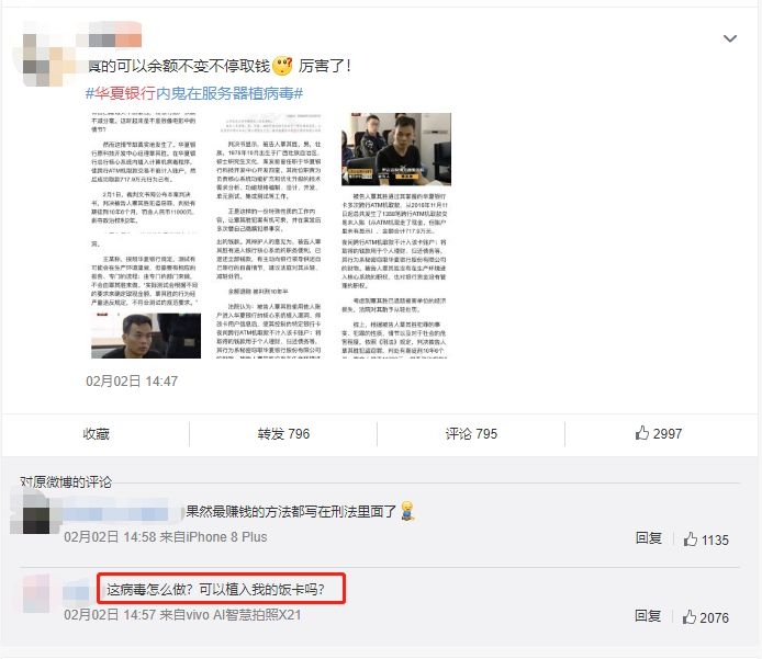 对于银行内部技术人员的盗窃操作,网友也关注较多。有调侃希望饭卡中植入此等程序,也有认真的对华夏银行的监管能力表示担忧。