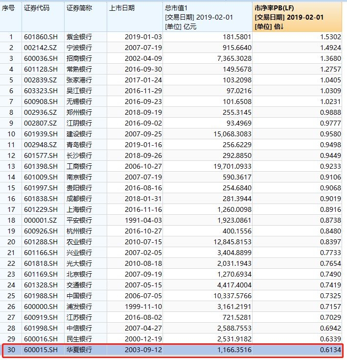资本市场对华夏银行给予的估值不高。最新的总市值为1166亿元,市净率仅为0.61倍,在所有A股银行股中垫底。
