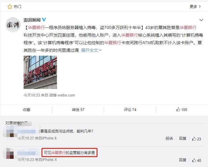 这一植入病毒可以无限取款的案件,在网络上也引发广泛关注,有网友对华夏银行的监管能力表示担忧。如此一家数万亿资产的银行,着实应当加强内控和管理。