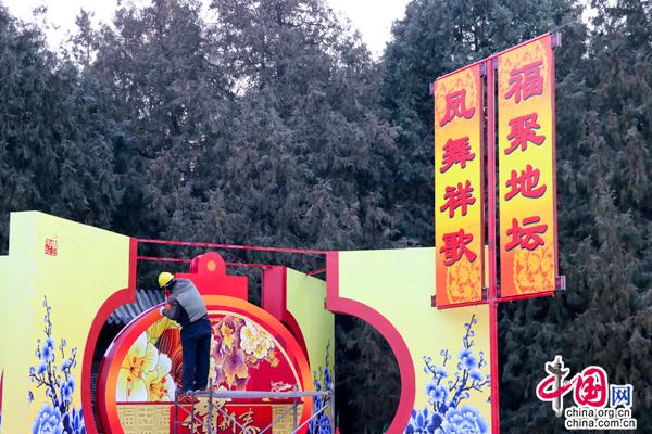 工作人员紧锣密鼓地布置庙会现场。中国网记者金慧慧摄