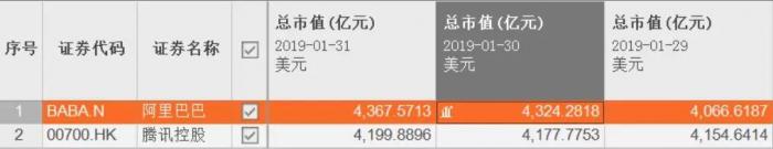 如下图所示,1月29日,腾讯的市值还领先阿里巴巴150亿美元;1月30日,阿里巴巴成功反超。