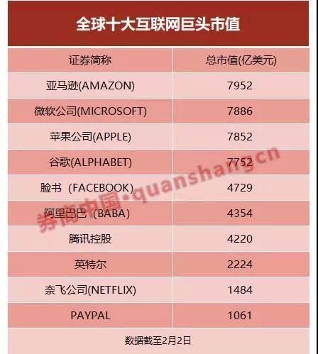 此外,英特尔、奈飞和PAYPAL的市值排在第8至第10。全球前十大互联网的公司的市值门槛均超过1000亿美元。