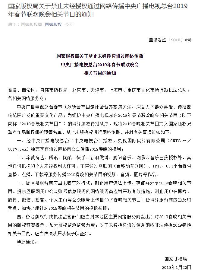 国家版权局:禁止未经授权通过网络传播2019年央视春晚
