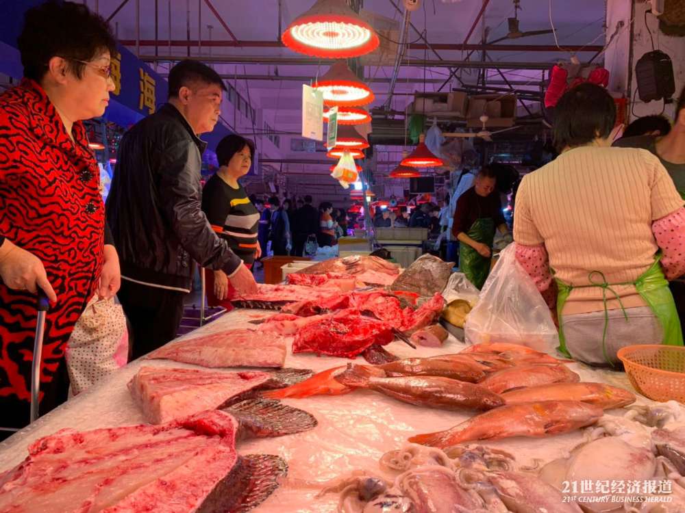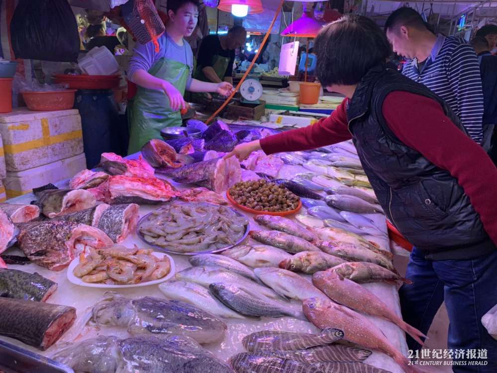 深海大鱼档口。据了解,深海鱼、海鲜等年三十的价格已接近平时的两倍。
