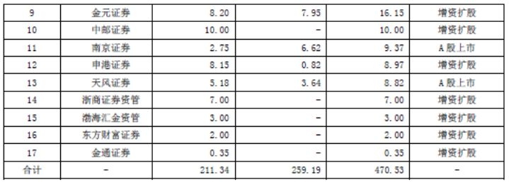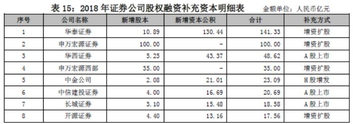 其中华泰证券募资141.33亿元,申万宏源证券100亿,申万宏源西部35亿,中金公司H股增发23.09亿元,开源证券增资扩股17.56亿元,金元证券增资扩股16.15亿元,中邮证券增资扩股10亿,申港证券8.97亿元,浙商资管7亿,渤海汇金3亿,东方财富证券2亿,金通证券0.35亿元。