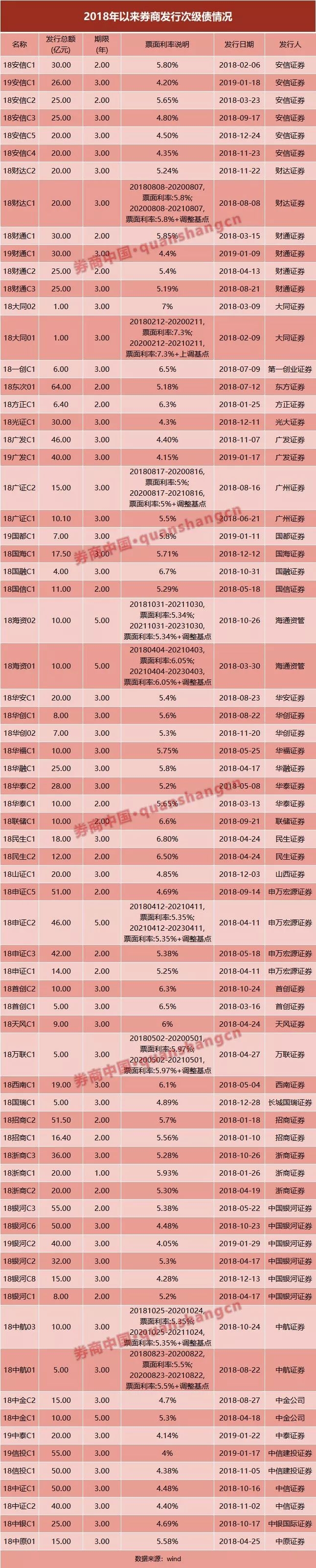 银河证券和安信证券均分别发行了6期次级债,银河证券共以次级债形式募资200亿元,安信证券共募资146亿元。申万宏源发行了4期次级债,共募资153亿元。