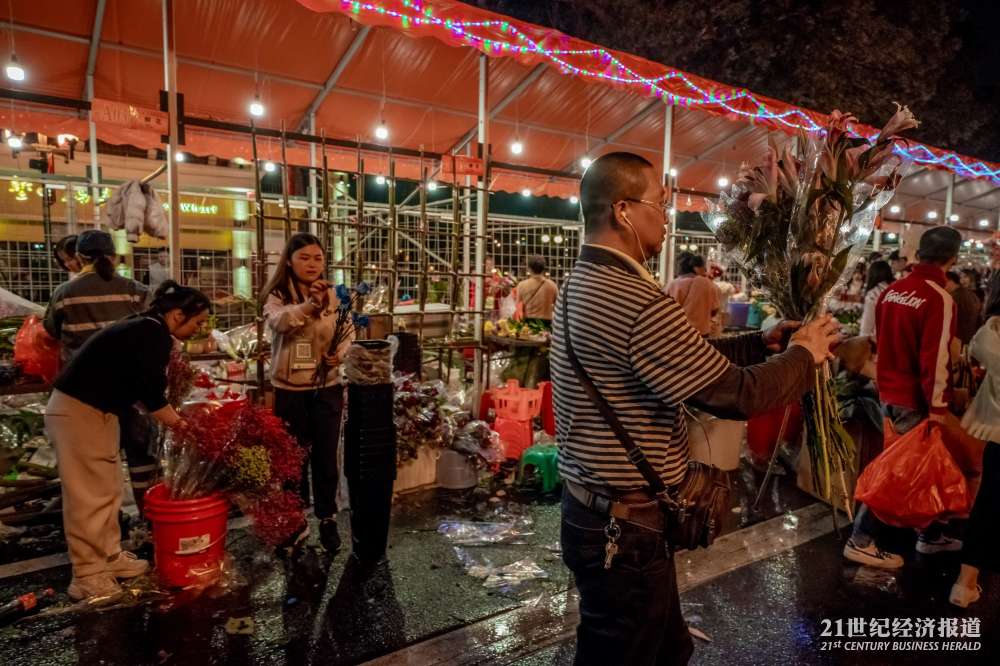 临近收市,花市电源已经被切断,可是商贩打开手机手电,继续去库存。