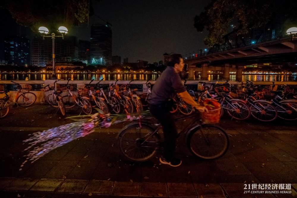 为了方便疏导海珠花市的客流,珠江河堤边摆满了共享单车。